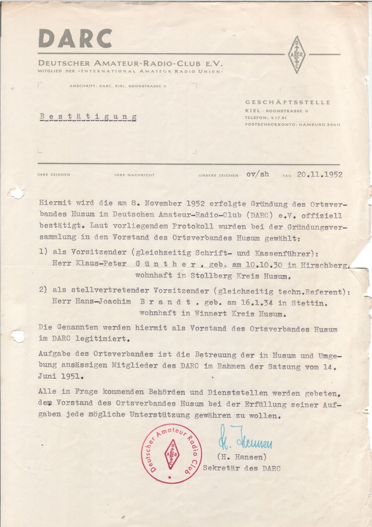 Beim Durchstöbern von alten Unterlagen wurde OVV Wolfgang, DK7UY, unter anderem auch auf das Gründungsdatum des Ortsverbandes Husum (M04), dem 08. November 1952, aufmerksam.
