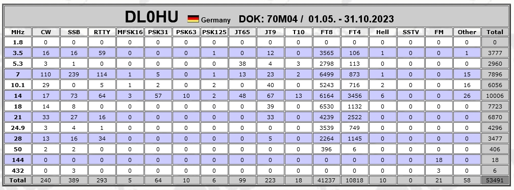 Die Aktivitäten mit unserem Klubrufzeichen DL0HU und dem Sonder-DOK 70M04, fanden am 31.10.2023 um ca. 22:00 Uhr ihr Ende. Es kamen insgesamt 53491 Verbindungen in fast allen Betriebsarten in das Logbuch, das ist definitiv ein Rekord bei M04!