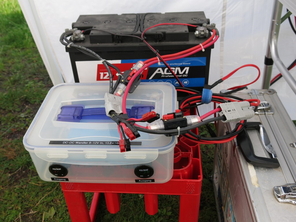 Umso größer war die Freude als – verstärkt durch sechs Gäste des OV Heide (M17) – insgesamt 13 Funkamateure Ihre Antennen und Geräte für Kurzwelle und UKW aufbauten, das Fieldday-Gelände mit HF verseuchten und viele QSOs abwickelten. Auch der erstmals zum Einsatz gekommene „Step-Up“-Spannungswandler, der selbst bei einer Batteriespannung von unter 9 Volt noch sichere 13,8 Volt bei 18 Ampere am Ausgang bereitstellt, hatte seine Feuerprobe bestanden. Wer Interesse an diesem Projekt von Wolfgang DK7UY hat, kann sich gerne unter mail'at'dk7uy.de melden, um eine Projektbeschreibung zu erhalten.