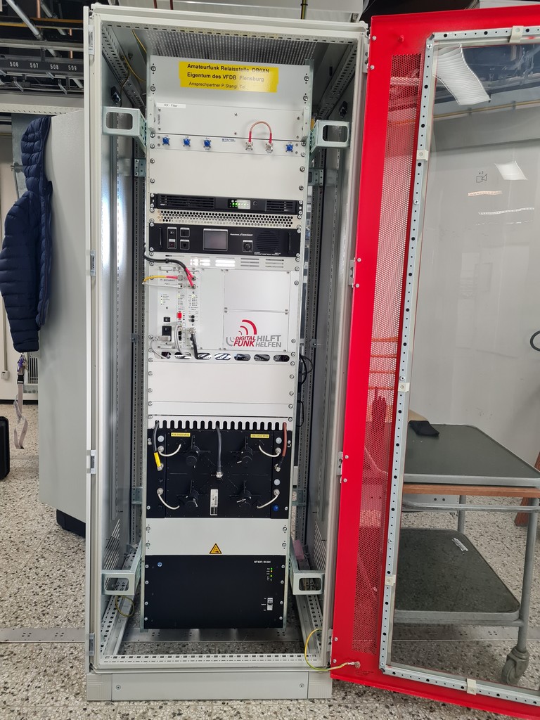 Der Schrank wird bei Stromausfall, wie die gesamte Elektronik auf dem Turm, mit einem Generator versorgt. Zusätzlich befindet sich eine 100AH Batterie zur zusätzlichen Notstromversorgung unten in dem Rack.