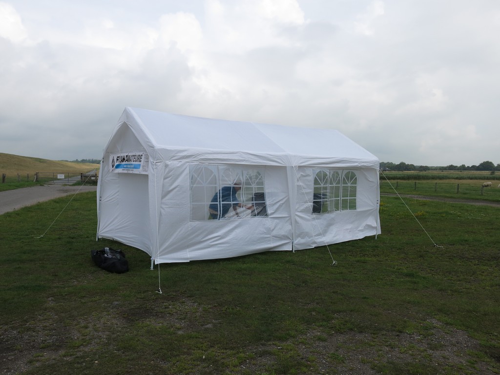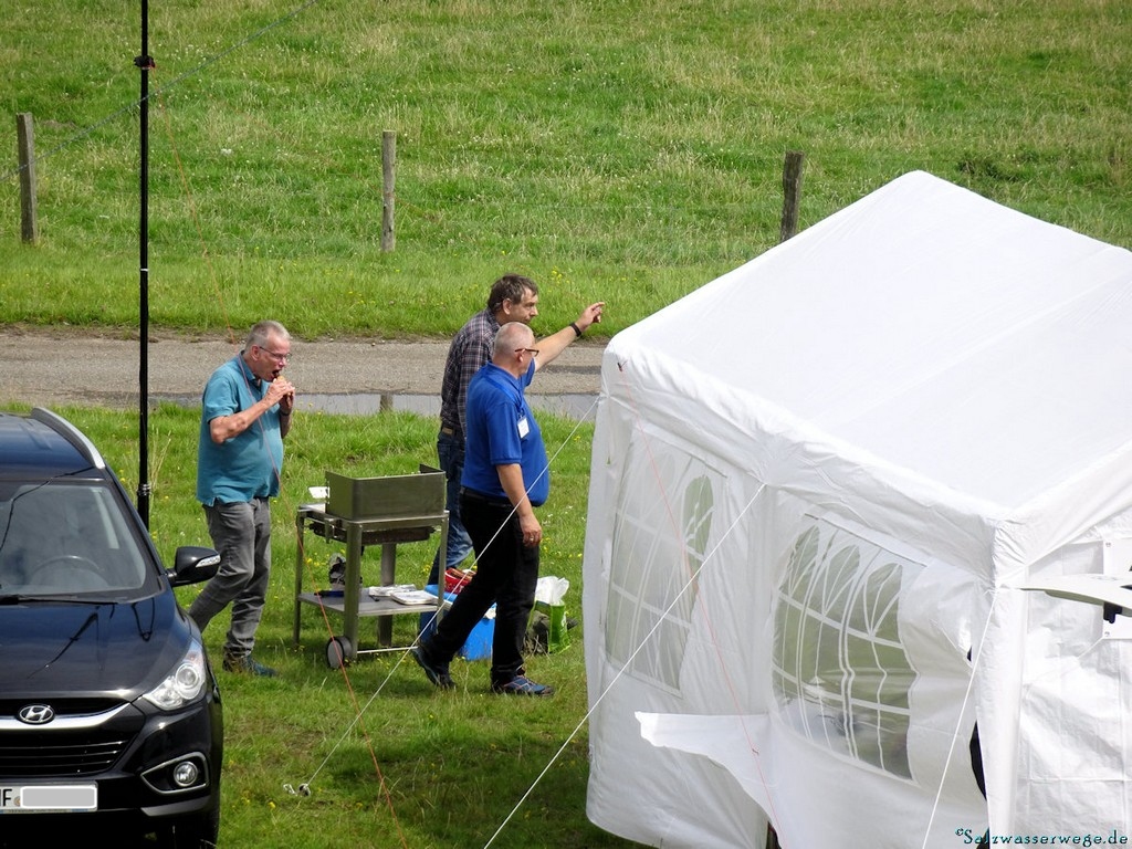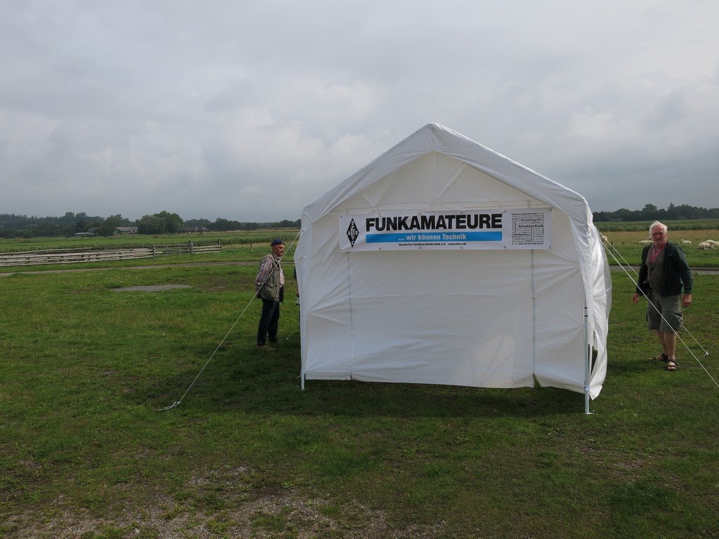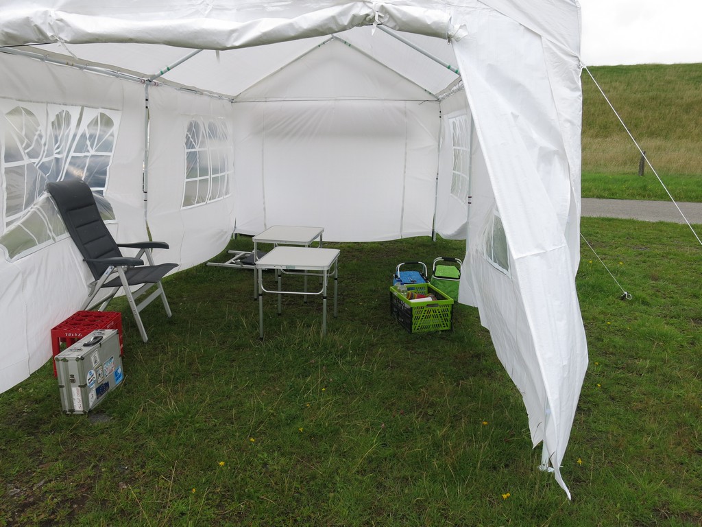 Regenschauer nach dem Zeltaufbau herrschte schönstes Wetter. Ursprünglich war lediglich ein Beisammensein sowie ein Testaufbau der mitgebrachten Stationen geplant, um zu sehen, wo noch Defizite für einen größeren Fieldday liegen. Aus diesem Grund wurde im Vorfeld keine große „Werbung“ gemacht und nur die unmittelbaren Nachbarortsverbände informiert.