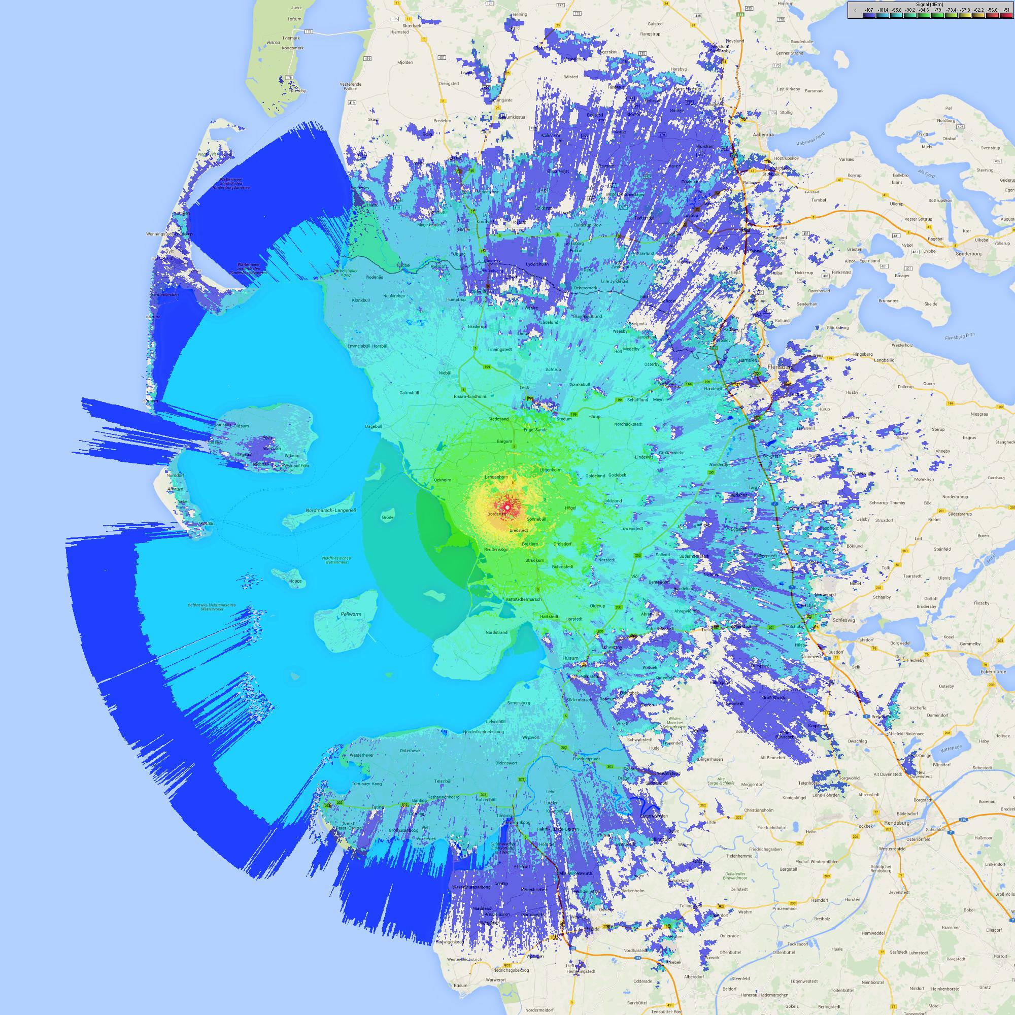 Das Strahlungsdiagramm von DB0XN, mit Referenz Mobilstation RX Empfindlichkeit 0,2uV und 2m Antennenhöhe über Grund, zeigt die Ausleuchtung des gesamten Kreises Nordfriesland incl. Sylt und den Halligen, Flensburg/Schleswig und weite Teile von Dithmarschen.