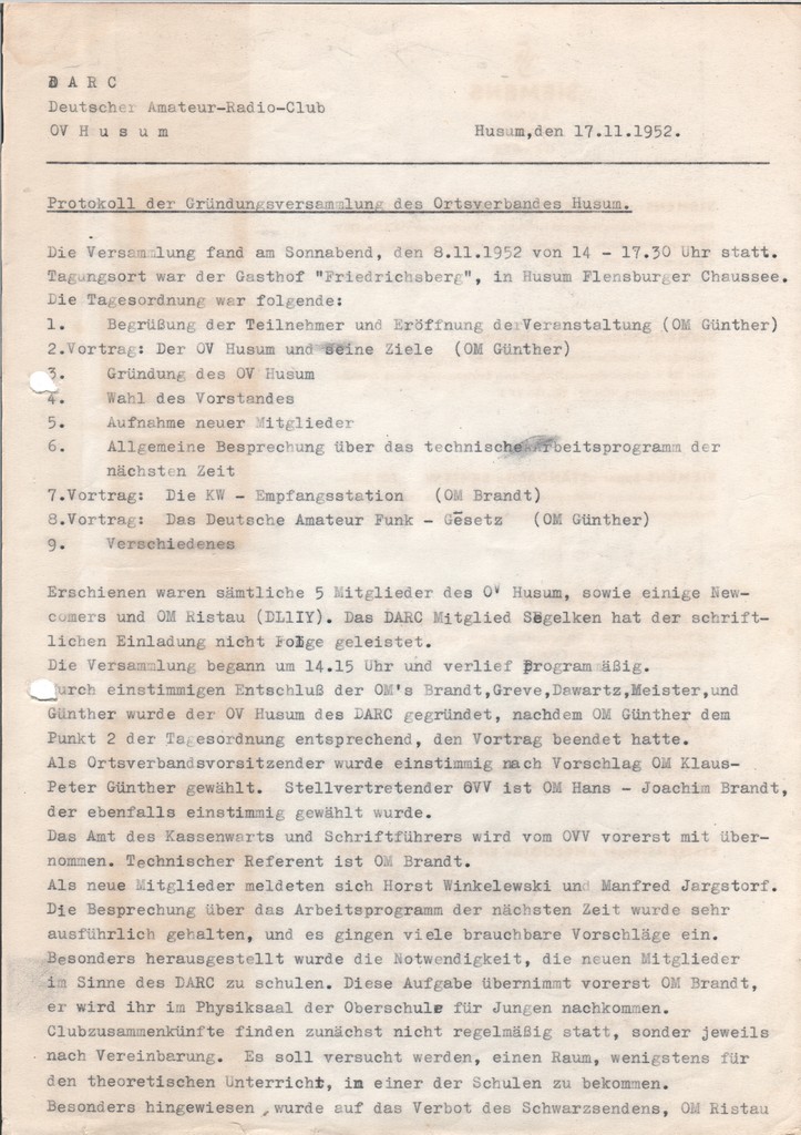 Der Ortsverband Husum (M04) wurde am 8. November im Jahre 1952 durch eine kleine Anzahl von Funkamateuren ins Leben gerufen und zwar in der Gastwirtschaft "Friedrichsberg", Ecke Flensburger/Schleswiger Chaussee.